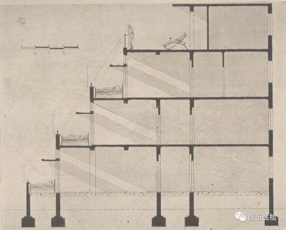 (主楼剖面图,退台式设计让每一层病房都可享受充足的阳光)此后,中国走上了由国家制定规划,规范性的预防和治疗结核病的道路。新中国成立以来,结核病防治工作划分为创业时期(1949-1977年)、振兴时期1978-1990年)、巩固发展时期(1911-2000年)、提高创新时期(2011-2010年)和高质量发展时期(2011年至今)等五个阶段。