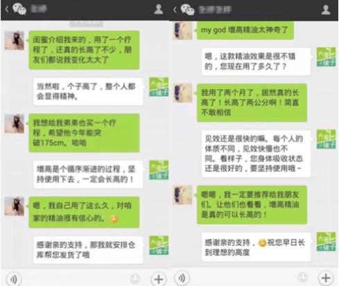 近期,市民李女士反映,朋友给她推荐了某微商品牌的增高精油,李女士想给自己的孩子买,但不知道这款产品是否有效果。李女士说:“前段时间朋友告诉我网上有卖增高精油的,说是抹在孩子的脚底并按摩就能长个儿。”增高精油宣传出来的效果让李女士有些心动,可又怕白白浪费钱。增高产品的市场不仅面对儿童开放,不少产品还盯上了成年人。在某购物平台上,一款月销上千件的增高精油引起编者注意。