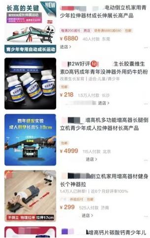 编者还在某电商平台发现,众多“长高”产品,如长高神器、长高钙片、长高激素、长高拉伸器等等,销量很高,仅其中一款长高钙片的月销量就有5万多单。“再见太矮”“挑战大长腿”“再高10-15厘米”等,成为商家标注的噱头。