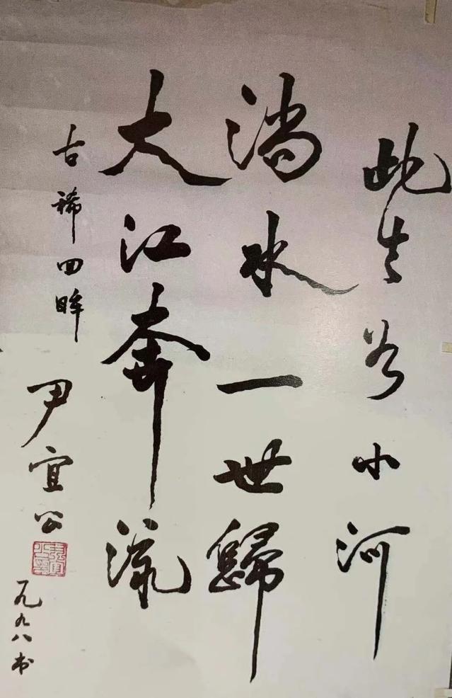 年轻时的尹宜公尹宜公还搜集整理了《绣香袋》、《大理海子挨挨》、《隔山叫你山答应》、《竹四郎》、《狮子滚绣球》等弥渡民歌和花灯,其中由他收集整理的弥渡民歌《小河淌水》成为了世界名曲,曾经在奥运会上传唱,被选编入美国等西方国家中学音乐教材,在我国众多民歌中,能与其媲美者仅有《茉莉花》等不多的几首。一个早期地下党负责人既能很好地领导革命斗争,还能成为著名艺术家、世界名曲《小河淌水》的搜集整理者,充分体现了共产党员“三个代表”的先进性,特别是代表了先进文化的前进方向。