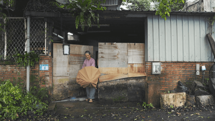 一楼的天花板水泥严重剥落,钢筋结构裸露,外层架设了铁网以免碎块砸下来。室内有一股很重的潮湿味,随意堆放的书籍杂志泛黄破损,几乎变成一间储藏室。陈九骆住的是偷工减料盖成的“海砂屋”,水泥里混了海砂,时间久了就开始崩塌,住了20年,房子已成危楼。每当下起大雨,屋里还会严重漏水。