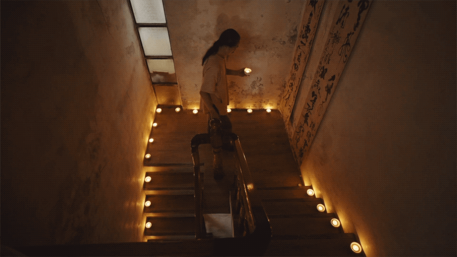 沿着楼梯往上走,整面墙上都是灰青色的霉斑,拐角处挂了两副2.5米长的字,陈九骆在每一阶楼梯上都点上了蜡烛,昏暗破败的空间里,另有一种风雅浪漫。“我好久不让人家来了,地方太破,羞于见人。”