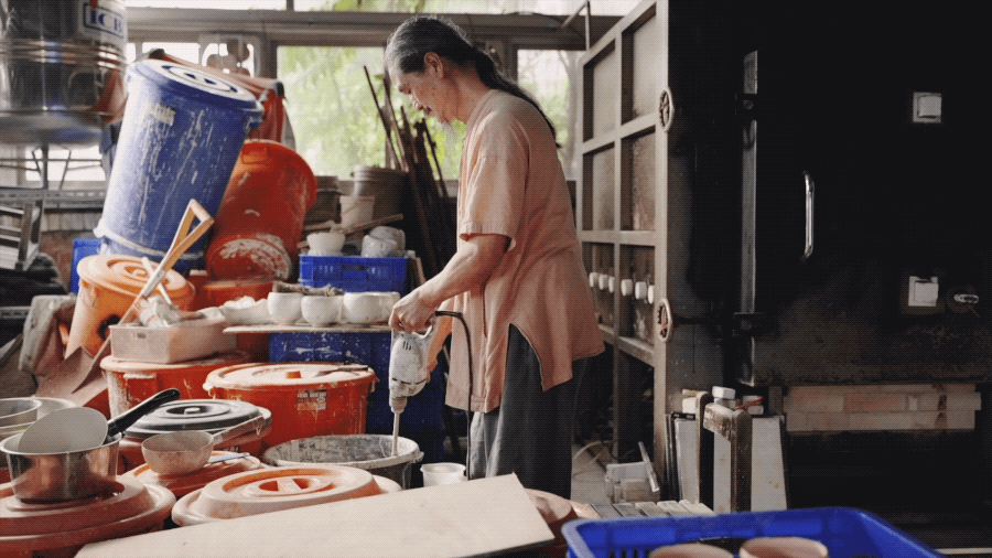 陈九骆20多岁时就很欣赏陶艺之美,工作之余,经常去找老师傅学拉坯,也学过釉药。
