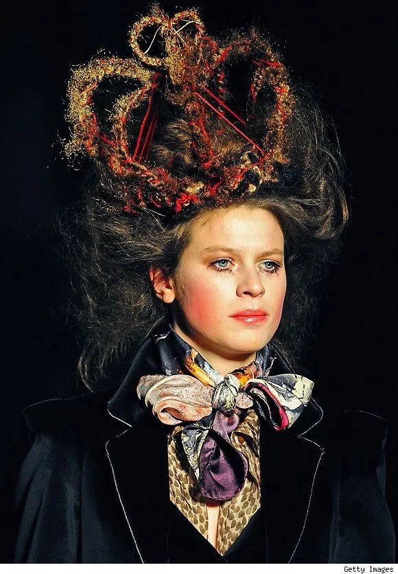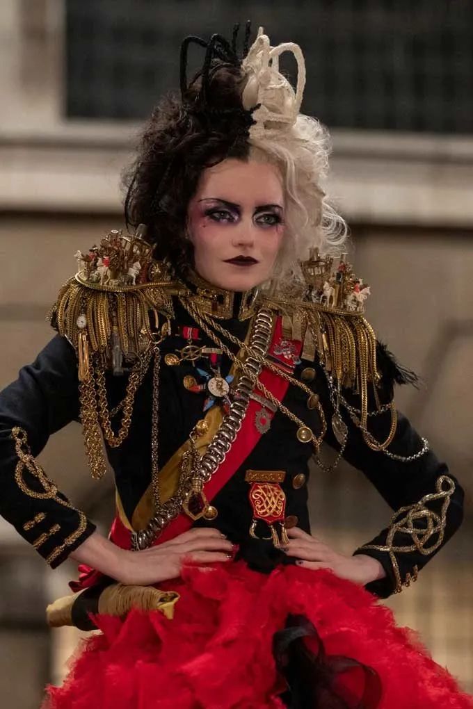 大写FUTURE的脸部涂鸦,非黑即白要么就是血红的造型,统统找得到原型,但确实,也只有朋克教母那些惊世骇俗的作品,才能和Cruella的时髦野心相匹配。