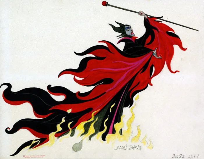 巧了,和Cruella一样, Maleficent的动画形象同样出自动画师Mark Davis之手。他把Maleficent设计得像被吸血蝙蝠附体的白日美人,棱角极尽尖锐,要的就是一种不讨好任何人的美艳。