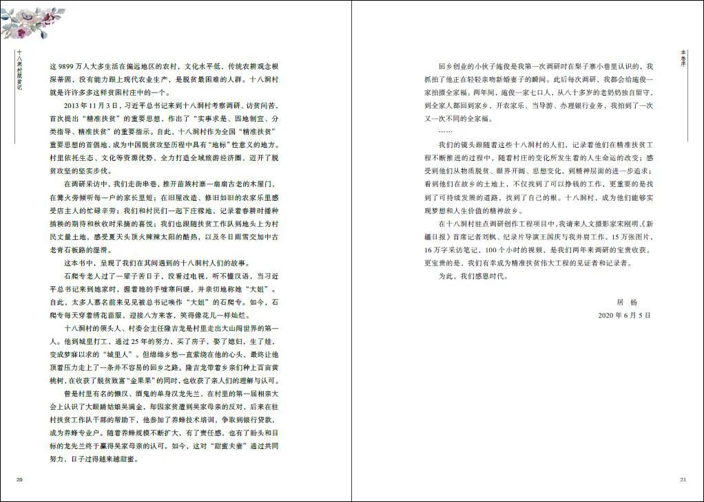 主编居杨和创作团队带着高度的责任感和使命感,多次深入湖南省湘西土家族苗族自治州花垣县十八洞村驻点调研,通过文字、图片和视频多角度记录和呈现了十八洞村在扶贫政策的支持和扶贫工作队的帮助下所取得的喜人成果,并以一个个鲜活的案例讲述了十八洞人脱贫致富的感人故事,见证了十八洞人在脱贫路上的奋斗与梦想,以及十八洞人对未来美好生活的向往和期待。本书不仅具有较高的文学艺术价值,而且具有较高的文献史料价值。
