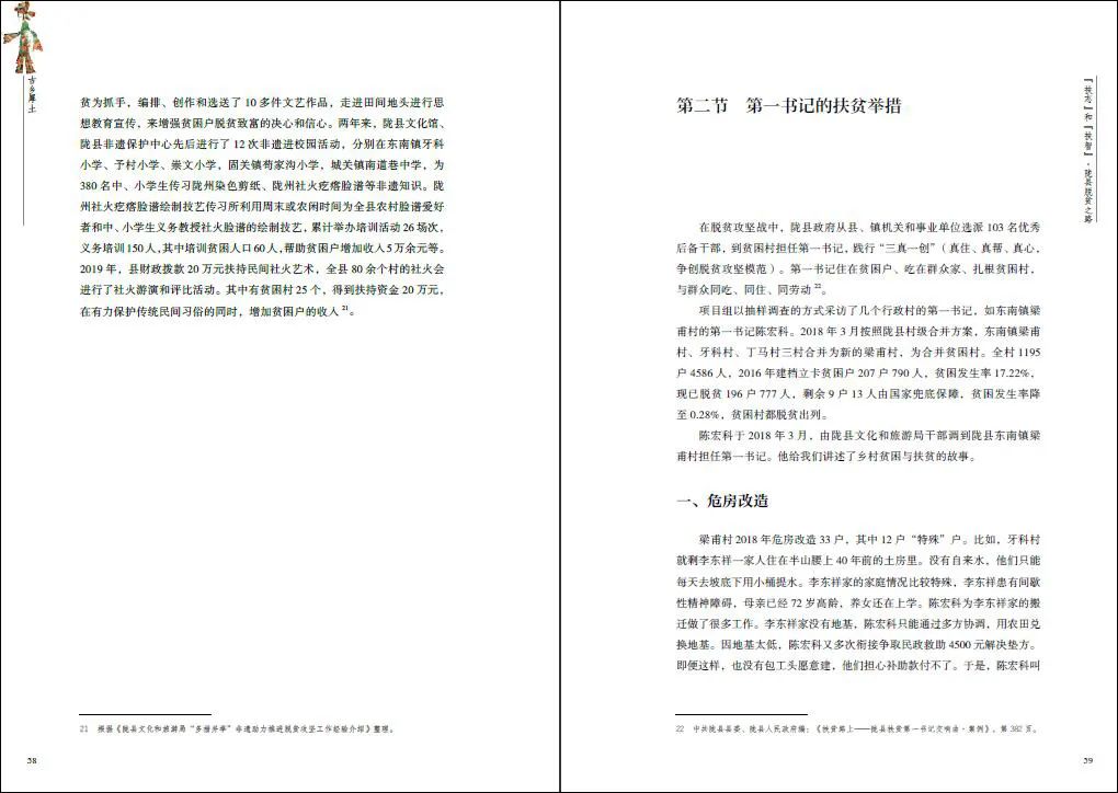 本书以陇县为驻点地,自2018年8月起,陇县驻点调研创作项目组一行5人6次到陇县做调研与回访调查,走访了20多个村庄,深度采访了20多个乡村第一书记、村委会主任和村干部,也采访了陇县县委书记,并一同走访调研了乡村扶贫工作中的典型个案。其后则着重叙述了陇县当地的民俗艺术,以及以脱贫个案的形式展示了当地是怎样以民俗艺术为依托来带动当地经济发展的。