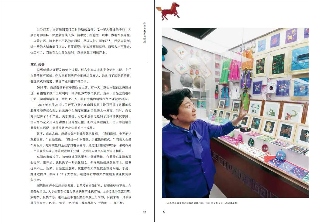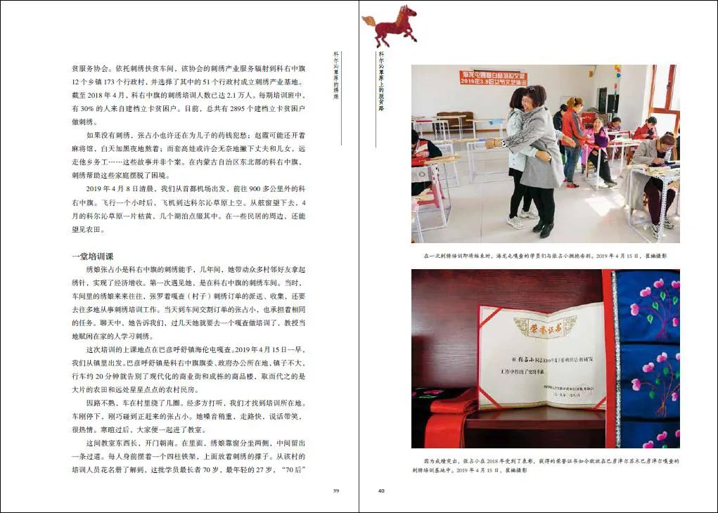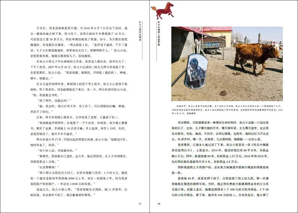 本书是毛建军带领创作团队在科右中旗驻点调研的创作成果。科右中旗是内蒙古自治区乃至全国蒙古族人口比例最高的少数民族聚居旗,是国家级贫困旗,也是大兴安岭南麓集中连片特困区,在内蒙古自治区乃至全国脱贫攻坚战中极具代表性。书稿从刺绣绣产业、马产业、肉牛养殖、民族手工艺等几个角度,通过讲述几位具有代表性的贫困户通过产业扶持实现稳定增收的故事,向读者展现了科右中旗的脱贫攻坚之路。书稿以直观素朴的影像、平实深刻的文字、鲜活典型的人物、生动细腻的故事,记录百姓生活状态和精神面貌的改变,歌颂了脱贫攻坚的伟大实践。