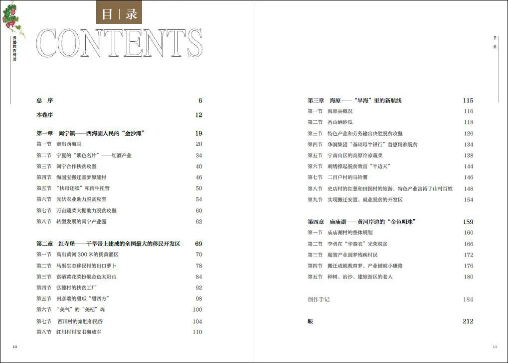 全书主要由“闽宁镇—西海固人民的‘金沙滩’”“红寺堡——干旱带上建成的全国最大的移民开发区”“海原—‘旱海’里的新航线”“庙庙湖——黄河岸边的‘金色明珠’”“创作手记”组成。创作团队选择在春、夏、秋、冬 4 个季节赶赴闽宁镇、红寺堡区、庙庙湖村和海原县等西海固地区,走进干部、村民的生活,体会他们的喜怒哀乐和酸甜苦辣,倾听他们的故事,见证西海固人民脱贫致富的人间奇迹。他们将这些记录整理成《沸腾的西海固》一书,见证这份生生不息的坚持。