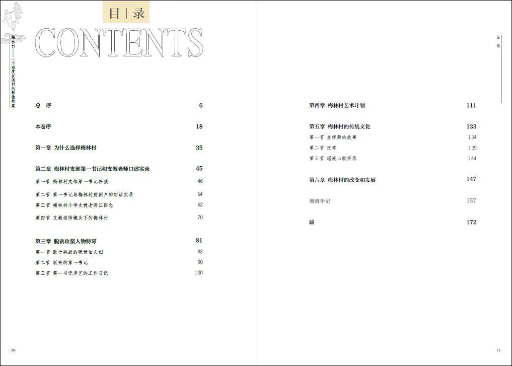 全书主要由“为什么选择梅林村”“梅林村支部第一书记和支教老师口述实录”“脱贫攻坚人物特写”“梅林村艺术计划”“梅林村的传统文化”“梅林村的改变和发展”“调研手记”组成。本书中的影像主要以环境肖像的形式拍摄,村民在自己熟悉的环境里面对镜头时不会显得过于紧张,拍出来的肖像更接近自然状态。梅林村的村民都是一些“小人物”,但他们值得被书写。他们的内心世界、他们的精神与尊严都应该被展现、被看见。在这场人类历史上困难最多、力度最大、成效最高的脱贫攻坚行动中,每一位村民和扶贫干部都是主角。