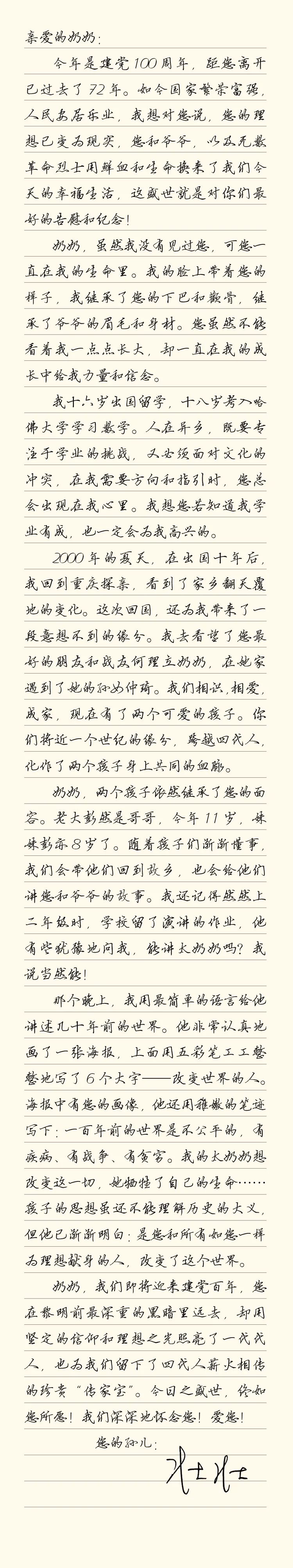 江竹筠烈士的革命故事被镌刻在共和国的丰碑上,她坚定的革命信仰和崇高的革命精神在烈火中永生,深深影响了一代代中国人,也成为她留给家族生生不息的红色基因。站在即将迎来建党百年的时间节点,彭壮壮希望用这封跨越时空的家书告慰奶奶,他也将会与家人一起,继续矢志传承红色家风,守护好这份独一无二的珍贵“传家宝”。