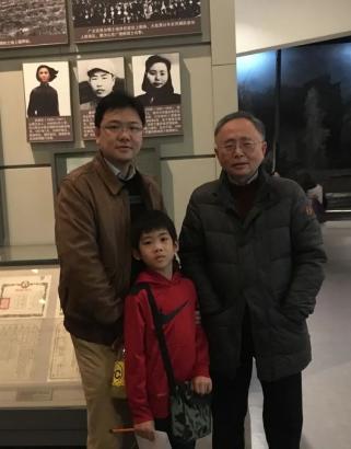 彭云、彭壮壮、彭然祖孙三人在江竹筠烈士照片前留影,四代人隔空“同框”
