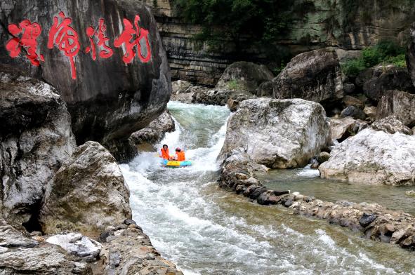 漂流景区内,崇山峻岭相峙奇峰怪石耸立,激流飞瀑跌宕,蓝天白云穿行