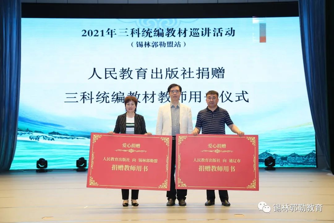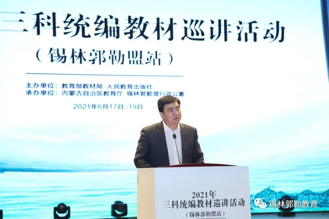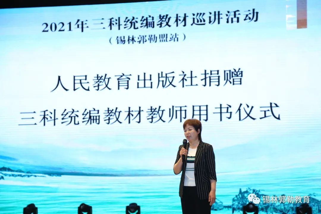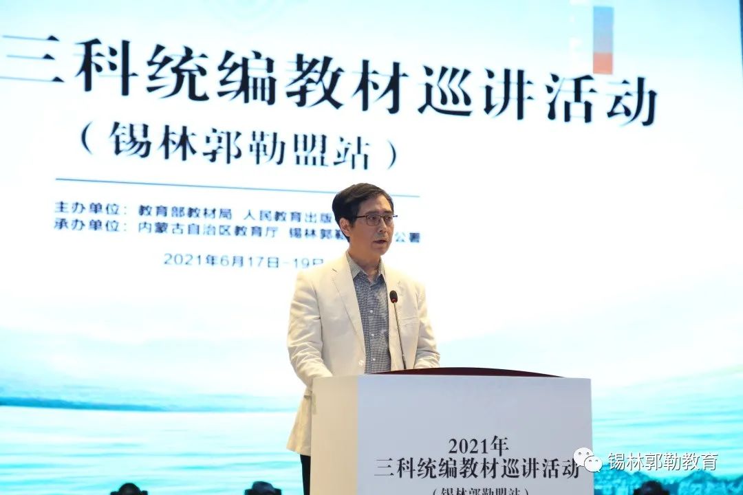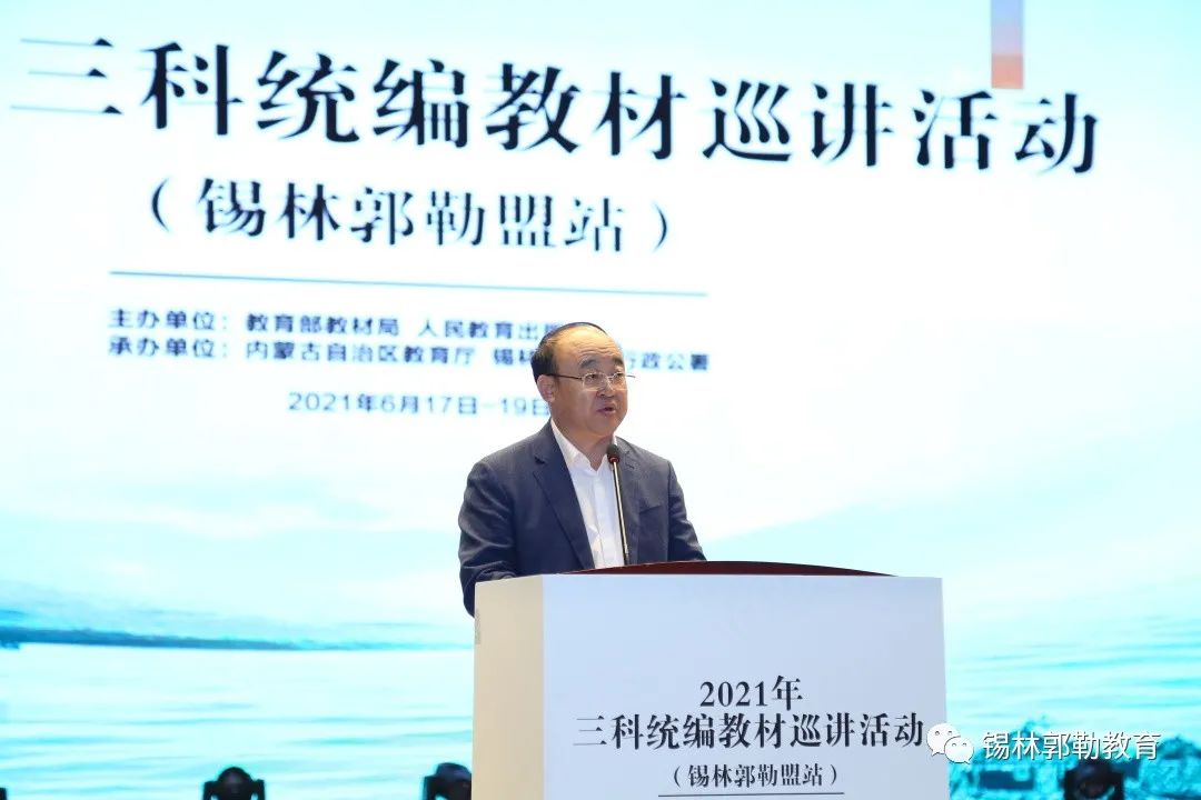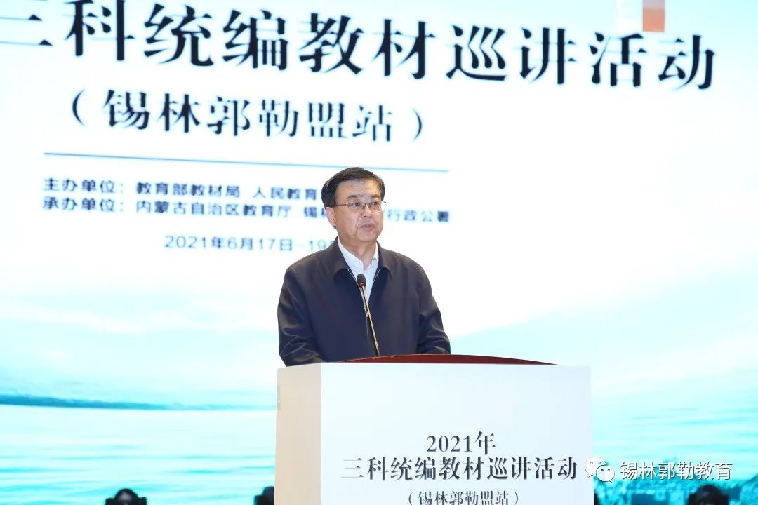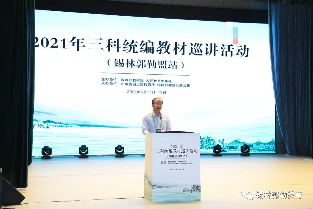 为全面贯彻落实中央关于推进三科统编教材使用工作的部署要求,扎实开展党史学习教育,推进“我为群众办实事”走深走实,保障民族语言授课学校师生用好国家统编教材,2021年6月17日至19日,由教育部教材局和人民教育出版社主办,内蒙古自治区教育厅、锡林郭勒盟行政公署承办、锡林郭勒盟教育局协办的国家三科统编教材巡讲活动在锡林浩特市召开。