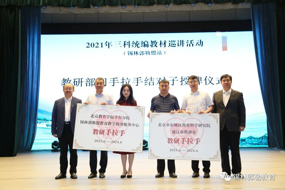 教育部教材局、人民教育出版社、内蒙古自治区教育厅、锡林郭勒盟行政公署相关领导出席启动仪式并讲话,北京教育学院丰台分院、北京市东城区教育科学研究院、内蒙古自治区教研室、通辽市教育局、通辽市教研室、锡林郭勒盟教育局、锡林郭勒盟教育教学指导服务中心相关负责人、盟旗两级三科教研员、全盟义务教育阶段民族语言授课学校统编三科教师及部分义务教育阶段普通学校统编三科教师共计600余人参加了活动。活动中,北京教育学院丰台分院与锡林郭勒盟教育教学指导服务中心、北京市东城区教育科学研究院与通辽市教研室进行了手拉手结对子签约仪式并现场授牌。人民教育出版社向锡林郭勒盟和通辽市捐赠了三科统编教材教师用书。