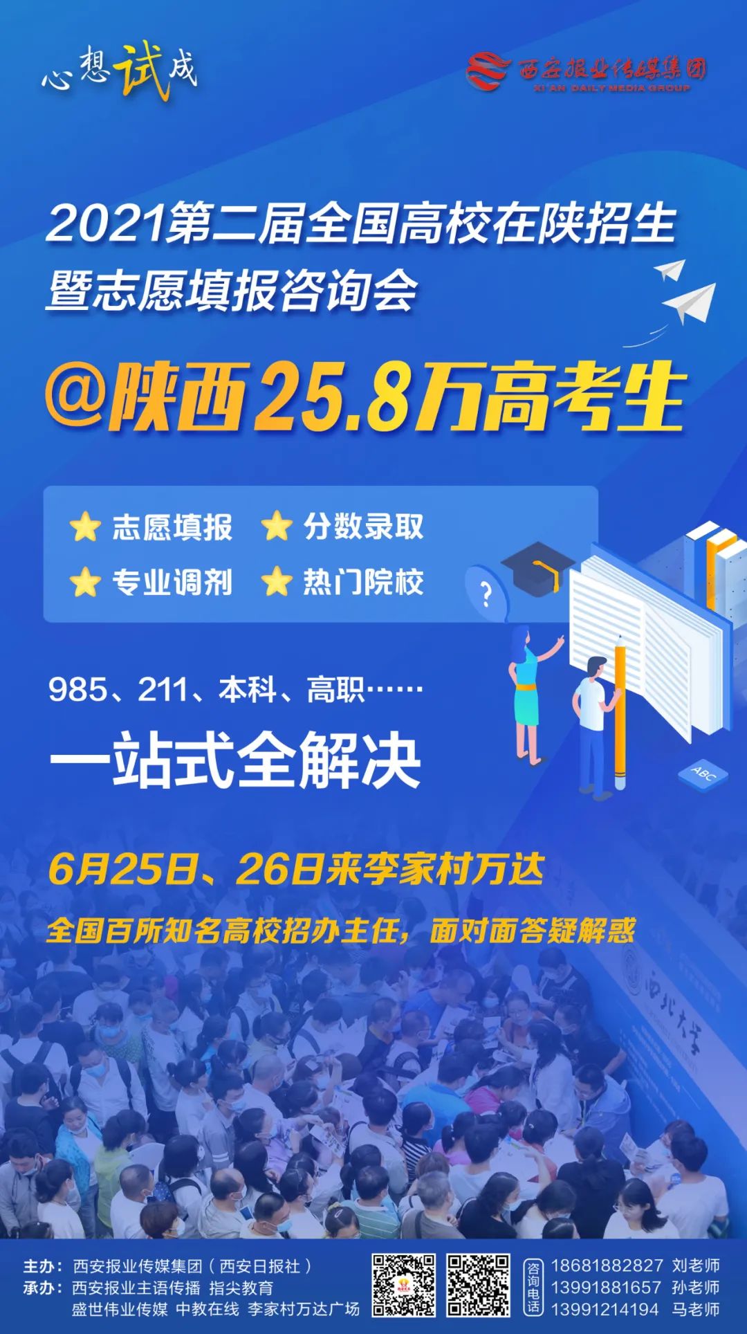 本届高招会由西安报业传媒集团(西安日报社)主办,西安报业主语传播、指尖教育、盛世伟业传媒、中教在线联合承办,西安李家村万达广场协办。多方强强联合,只为给全国各高校及广大莘莘学子搭建高质量、高品质沟通平台,提供“一站式”权威高效的咨询服务。