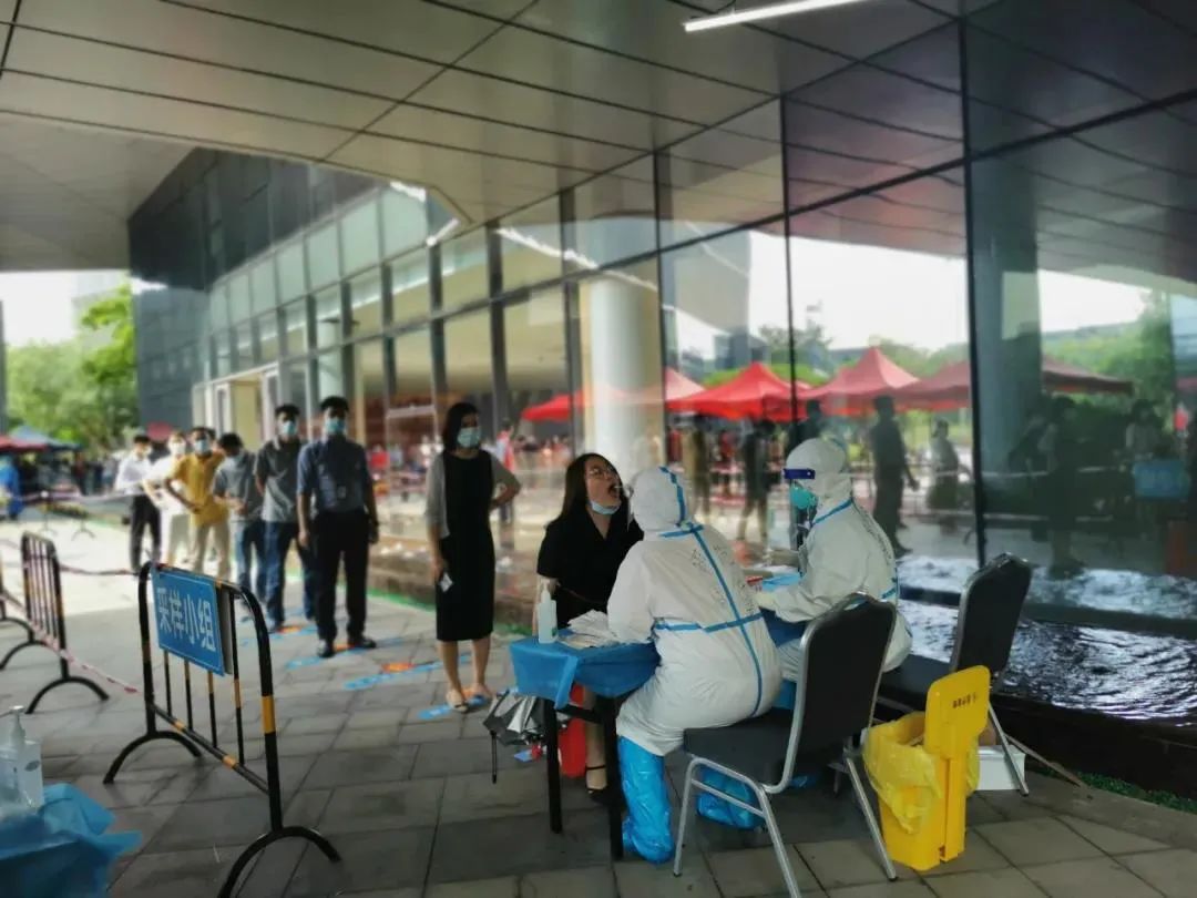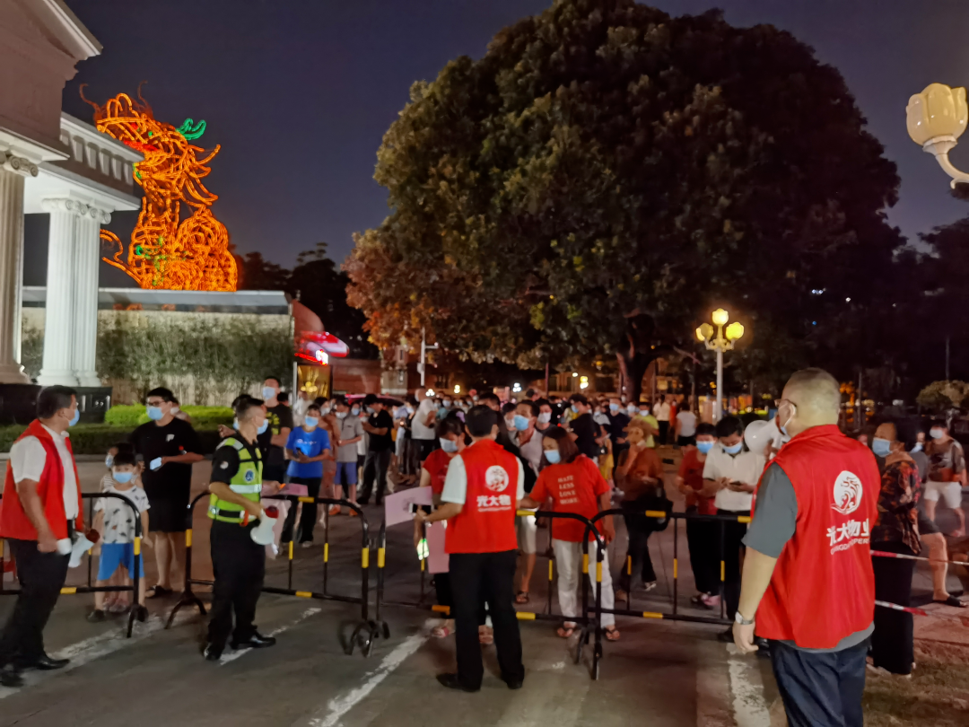 6月21日上午8时许,莞城工商联(商会)主席(会长)、宏达集团董事长袁斌接到来自莞城区府的消息:莞城核酸采样工作严重缺乏人手,需要志愿者协助!袁斌一声令下:宏达人行动起来,支援莞城抗疫!不到30分钟,50名宏达志愿者及党员整齐的集合在集团广场,严阵以待。袁斌叮嘱了安全注意事项,带领志愿者团队统一出发至莞城东门广场与莞城医务团队汇合。工作现场,莞城医务人员给宏达志愿者团队详细讲解了服务细则及安全防护内容,亲自演示了标准操作,并派发了专业防护用品给每一位志愿者。志愿者们快速换好服装,分组分工,火速上岗。志愿者分为两支团队,一支服务于东门广场,37名志愿者,这里是莞城核酸采集的重要区域,人流量大,人手紧缺,现场讲解/咨询和秩序管控是重点;一支服务于社区学左文化大楼,13名志愿者,这里主要针对村民及村内常驻居民进行核酸采集,场地较小,中老年人居多,因此需要大量的耐心辅导及人员导流。