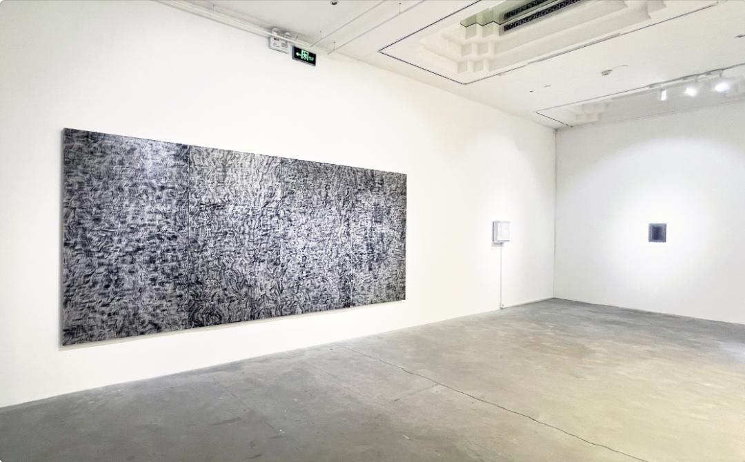 与夏云飞两件作品相邻的倪志琪老师作品展览最有趣味的部分,在不同风格艺术品的并置与对话。与夏云飞的展览相邻的是倪志琪老师的近作。那一组增加了随机书写元素的新近创作中具有隐秘的涂鸦元素,与夏云飞雕塑感的笔触相映成趣。而倪志琪老师的另一组新作《真空》由手工纸和细纱布料拼贴完成,正是四件棋盘的造型,是整个“出棋不意”展览中视觉经验的中心位置。