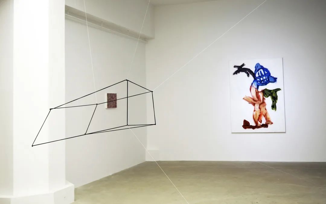 高入云的动态机械(活体,电机、尼龙线,2021)装置与夏云飞绘画(立着的,布面丙烯, 2020)中的动态形成一种互文