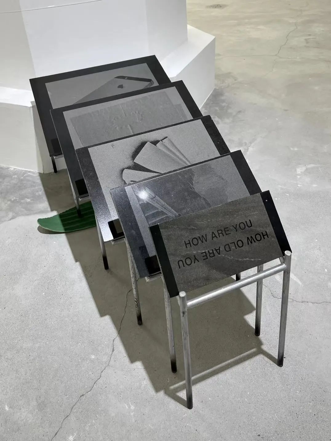 在高入云不断运动着的作品正前方,是他曾经的同班同学钟云舒的静止雕塑。钟云舒的作品《雕塑》倾向于以纪念碑的形式保存短暂易逝的内容,她用激光影雕把稍纵即逝的风景、柔软脆弱的纸张和塑料,以及迅速更新迭代的电子产品的图像刻在黑色的花岗岩上,化石或墓碑一般的质感又在艺术家的一句问候之下突然变得生动活泼:“你还好吗/你多大了”。