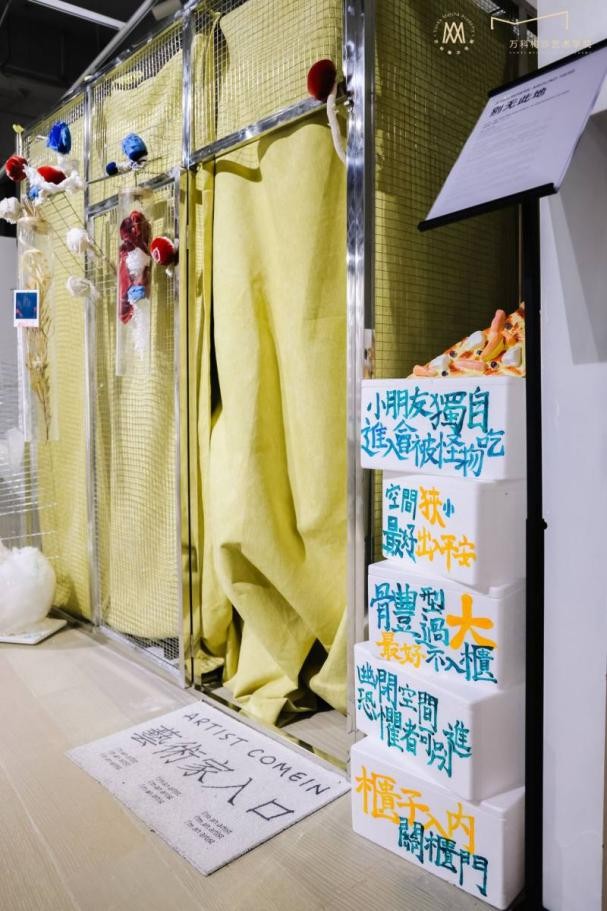 外表像是一个铁笼子,在学生们的装饰下,有了别具一格的味道。指导老师赖雨青表示小屋里三台投影与声音随机交互,每一个人的体验都不同,这才是独属于自己的别无此地。这里也是展会的“人气王”。
