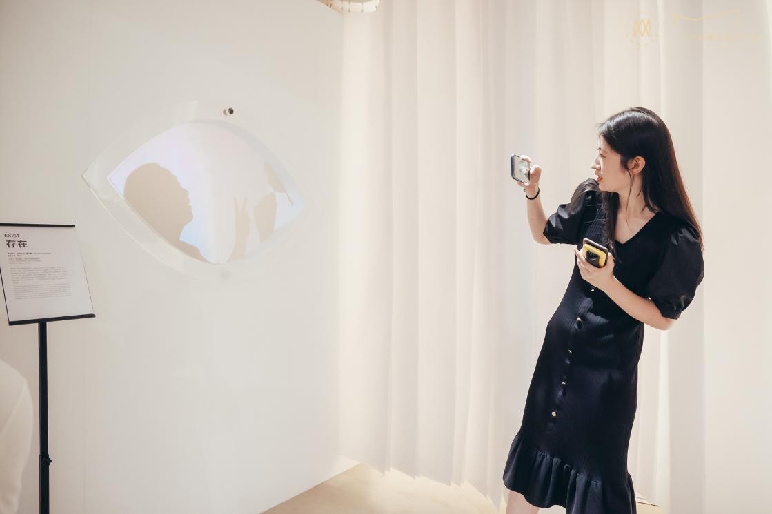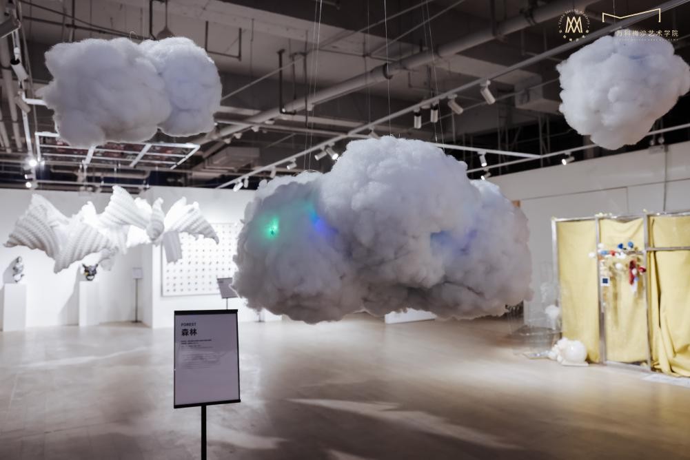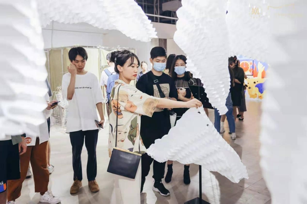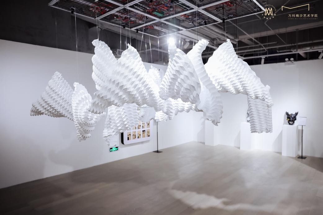 运用蝴蝶、PVC、棉花、LED 灯、镜面等元素所构建出的“森林”,让人记忆深刻。展厅正中是此次展会的亮点,代表了老师和学生们对艺术破圈的大胆思考和设计。石忞旻老师和书院STEAM课程的张了然老师带领6位同学别出心裁地使用纸和单片机电脑控制系统等,以跨媒介的方式,借助高科技的手段,创造性地设计了一个将人的互动转换成声或动能的互动装置,当观众尝试跟蜉影对话时,《蜉蝣》将会通过声音或运动与之“对话”。将感官世界抽丝剥茧,让观众触碰它存在的边界。所谓浮生一日,蜉蝣一世,转瞬即逝的生命激发了我们对生命本真的思考。石老师表示,这是一次跨界破圈作品的尝试,艺术与科学以一种现代形式结合起来。