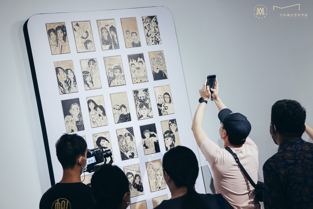 除了科技感,相较于《蜉蝣》,它左边的《自拍》就显得更加真实有趣。一幅幅木刻的版画风格各异,却都充满活力。这副作品是学生们在课堂上邀请一位自己很熟悉或很陌生的同学进行“自拍”,用木刻的形式表现出来,不仅在视觉上很有张力,触觉上也凹凸起伏,装裱形式类似于一块拓碑,排列方式也类似于碑帖的书写、阅读规范,用这种特别的展示方式记录“时光”,也记录下这一刻最美好的他们。在这反反复复的制作过程中,感受时间的流逝。
