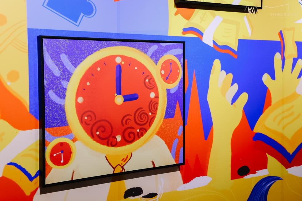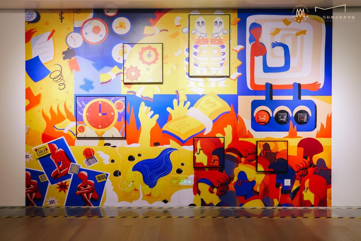 在展馆的墙壁上,有一幅巨大的立体墙绘,但是仔细看去,这里面还包含着不同的内容和社会思考。内卷、加班、拥挤、金钱、欲望、压力,这些现象通过学生们的思考和观察,以艺术的形式刻画《芸芸众生》。