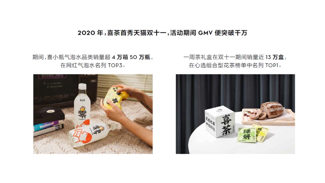 正是在这一系列实力的支撑下,短短一年时间,喜茶的瓶装饮料业务,已经取得了不俗的成就。随着产品力的不断加强,喜茶瓶装饮料产品快速获得了消费者的喜爱。2020年双十一期间,喜茶气泡水销量超4万箱、50万瓶,并位列天猫养生苏打水榜、网红气泡水榜、心选无糖气泡水榜、酸碱平衡苏打水榜等多个榜单销量TOP5。2021年春节期间,新品海盐柚子气泡水更是带动全线喜茶气泡水商品在年货节期间售出近6.5万箱、约75万瓶。