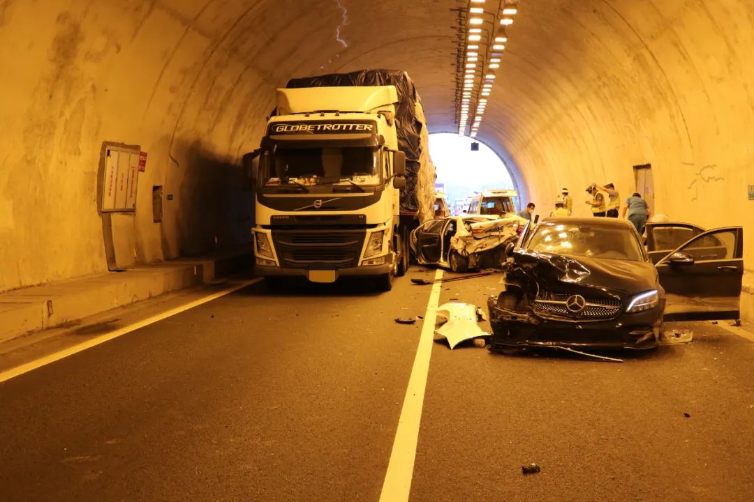 2020年5月12日15时45分,张某锋驾驶闽EQ***号小型轿车沿甬莞高速由漳州往广东方向行驶,行驶至A道1043公里加290米处,碰撞因车辆故障停于第二车道上、由陈某固驾驶的浙C5***号重型半挂牵引车牵引鲁H2***挂号重型平板半挂车左后侧,驾驶人张某锋在向左打方向的过程中,被途经该处的第一车道上由何某达驾驶的粤A6***号小型轿车碰撞,造成闽EQ***号乘客1人死亡、1人受伤的交通事故。