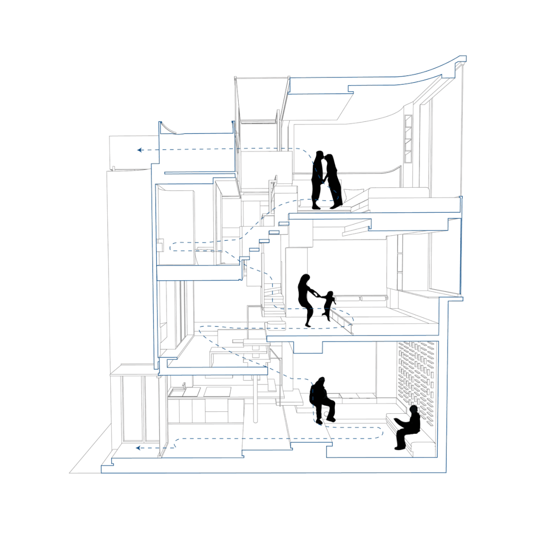 ▲错层的设计设计师团队由始至终都希望通过设计,让这个被称作“家”的房子能有更多可能相遇、相聚的空间,思考如何通过空间改变家人的相处模式,甚至是家庭关系。平衡人与建筑以及周围环境之间的关系至关重要。设计,要让居住者对家有持续的幸福感和居住渴望的氛围。