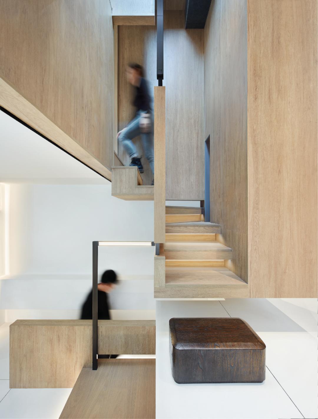 ▲楼梯由一楼串联各层错层的设计让空间与空间形成缝隙,透过缝隙,家人之间在不同楼层中都能构建一种视觉或听觉的联系,形成一种新的陪伴方式,让这个家创造更多趣性的体验。