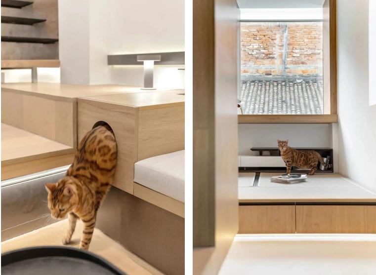 The Cattery-猫窝利用不同段差取代隔间做出空间区隔,多层次空间让铲屎官与猫主人能有更多若即若离的互动区域,两位铲屎官也可以随时监测到猫主人的动态。