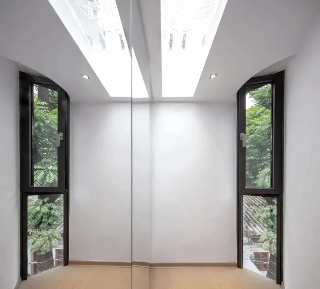 ▲充分利用的空间通高的公共走廊部分和胡同相连,像是胡同街道的延伸。通向后院的大門采用木质框架和透明玻璃,可以整体打开,任何时候都可以将庭院的景引入室内,人的活动可以同时在庭院进行,室内外互通,与自然融合。家不是一个封闭的房子,而是属于城市空间的一部分。