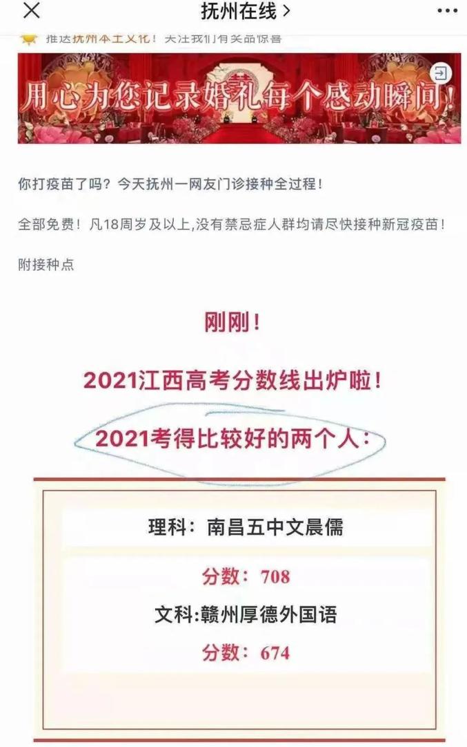 在江西,名为“抚州在线”的公众号在公布江西分数线的同时,还特意点出了“考得比较好的两个人”的成绩和学校,虽然什么都没说,但是大家都懂得……耐人琢磨的表述也激起了网友的创作灵感。