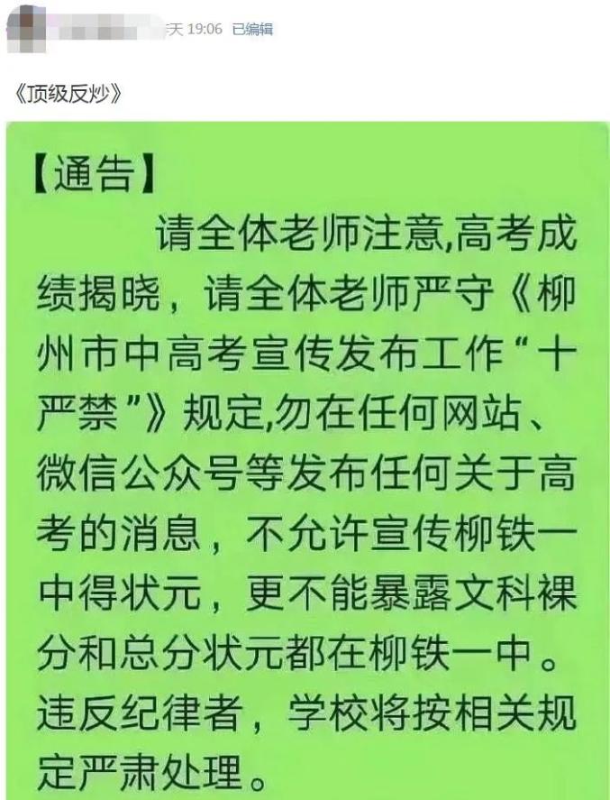 不过,这张截图已被官方“辟谣”。6月24日,柳州铁一中学在其官方微信公众号发布严正声明,表示“网络上出现和我校高考相关的信息,均非我校官方发布”。