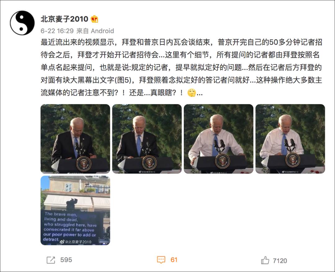 有微博用户称:“最近流出来的视频显示,拜登和普京日内瓦会谈结束,普京开完自己的50多分钟记者招待会之后,拜登才开始开记者招待会…这里有个细节,所有提问的记者都由拜登按照名单点名起来提问,也就是说:规定的记者,提早就拟定好的问题…然后在记者后方拜登的对面有块大黑幕出文字(图5),拜登照着念拟定好的答记者问就好...这种操作绝大多数主流媒体的记者注意不到?!还是...真眼瞎?!”