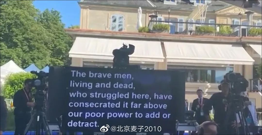 彭博社记者拍摄的现场提词器上的那段话源自美国总统亚布拉罕·林肯的《葛底斯堡演说》:“那些曾在这里战斗过的勇士们,活着的和去世的,已经使这块土地神圣化了,这远不是我们微薄的力量所能增减的(The brave men, living and dead, who struggled here, have consecrated it, far above our poor power to add or detract. )。”