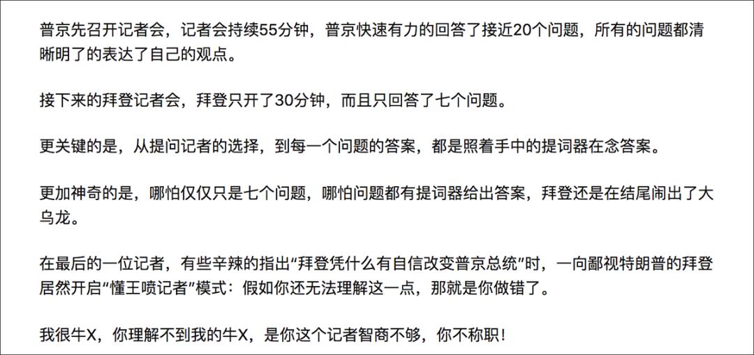 知乎上也有用户称:“拜登记者会,拜登只开了30分钟,而且只回答了七个问题。更关键的是,从提问记者的选择,到每一个问题的答案,都是照着手中的提词器在念答案。”
