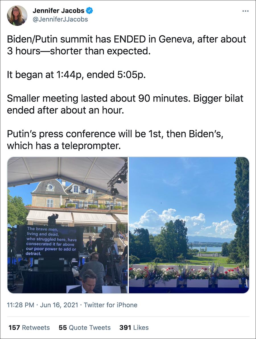 1,拜登答记者问有没有用提词器?使用Biden+teleprompter+Geneva为关键词检索,可以发现有关微博上的拜登记者会提词器照片来自彭博社白宫记者Jennifer Jacobs,她是此次拜登欧洲之旅的随行记者。照片发布于她的推特账号,拍摄于记者会召开之前。