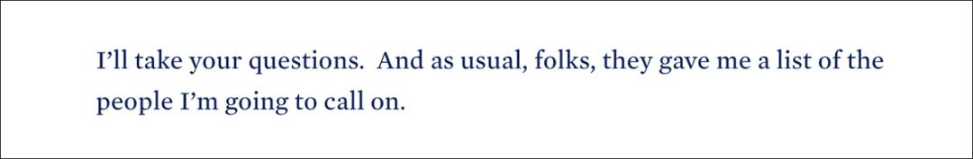 他说:“我认为他们这样做是出于两个原因。首要原因是信息纪律,这让他可以说,好,我们今天就只专注在1.9万亿法案的这一部分,我们今天就只谈航空业援助的问题,我们要保持专注。另一个原因是拜登并不善长即兴发言,他容易口误。如果他磕磕绊绊或者忘词,这又会引发对于他是否年龄太大无法胜任总统之职的讨论。”