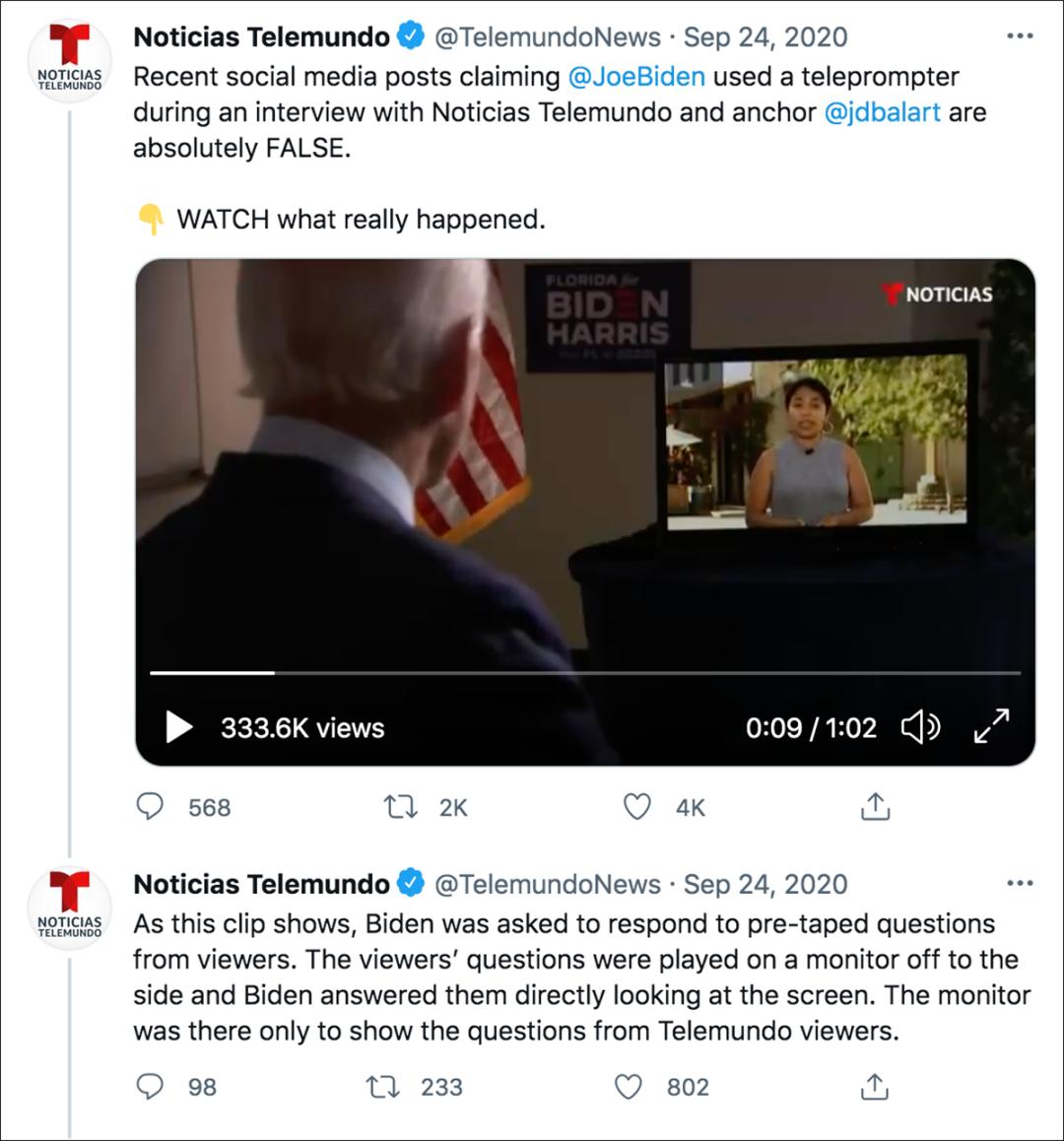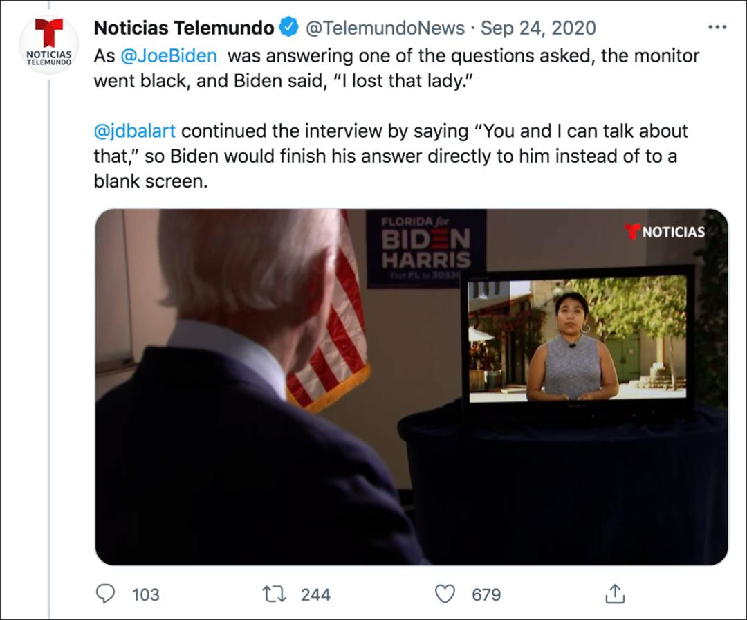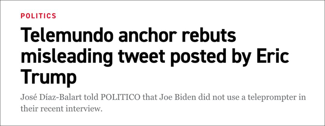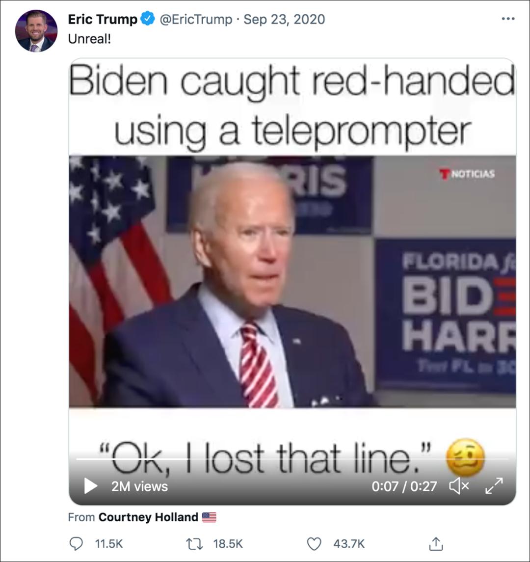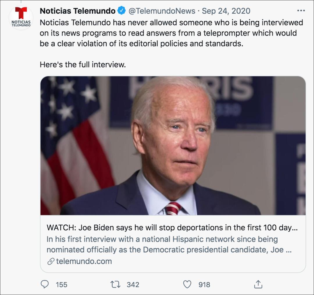 2020年9月23日,时任总统特朗普的儿子埃里克·特朗普(Eric Trump)在推特上发布了一段视频,称拜登在接受西班牙语电视网Telemundo主播何塞·迪亚兹-巴拉特(José Díaz-Balart)采访时“使用提词器被当场抓住”。