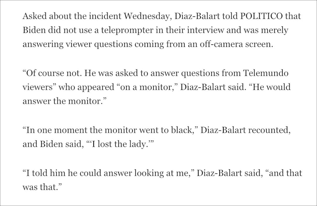 “当然没有。他被要求回答来自Telemundo电视台观众的问题,这些问题出现在一个显示器上,”迪亚兹-巴拉特说,“他要对着显示器回答。”“在某一时刻,显示器黑屏了,”迪亚兹-巴拉特对Politico说,“拜登说,’我看不见这位女士了’。我告诉他,他可以看着我回答。事情就是这样。”