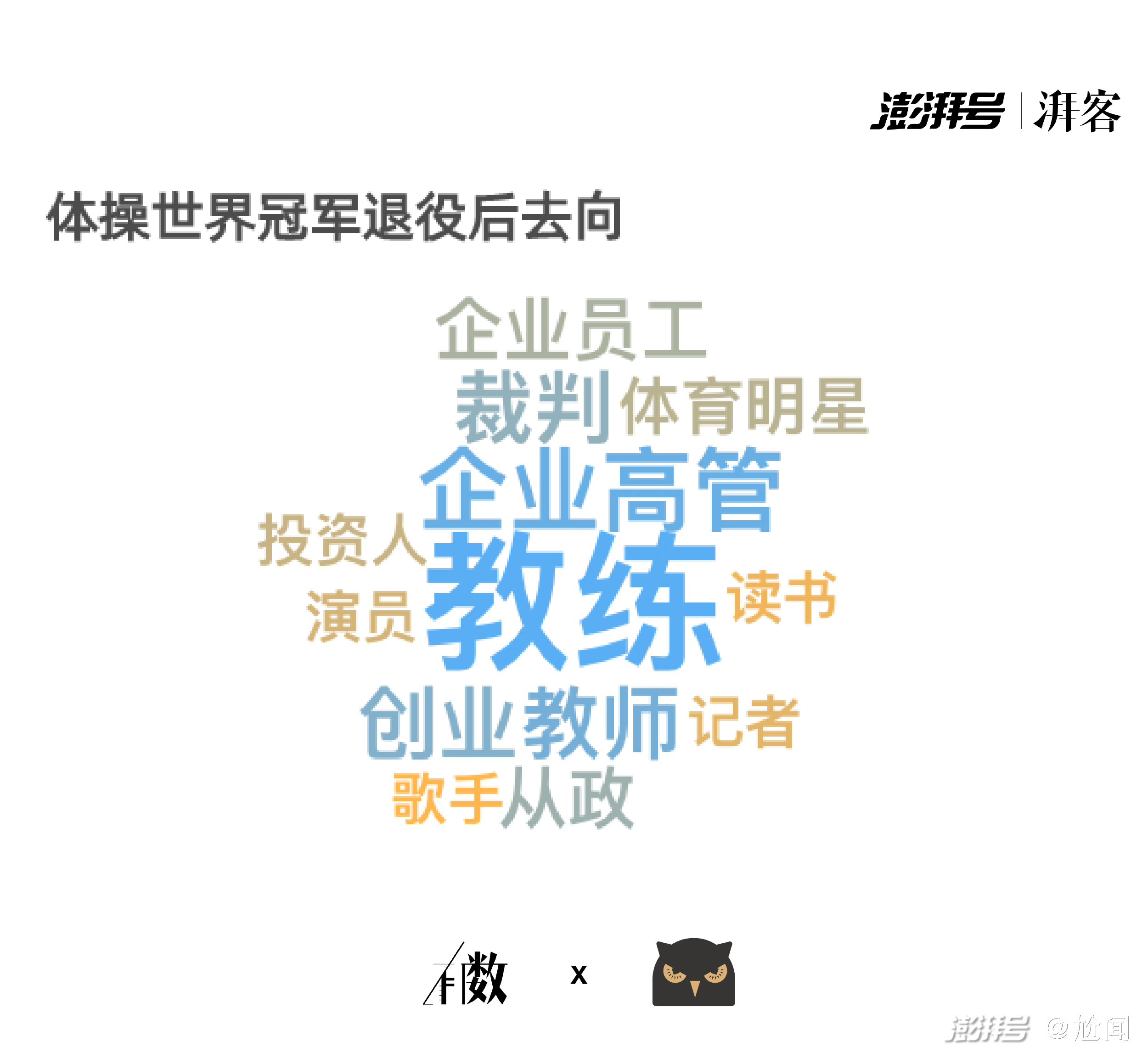 在这76位“上墙”的体操运动员中,退役后最多的选择是成为教练,占到近四成。此外,自主创业、从政行业,也成为了不少体操冠军运动员们的归宿。