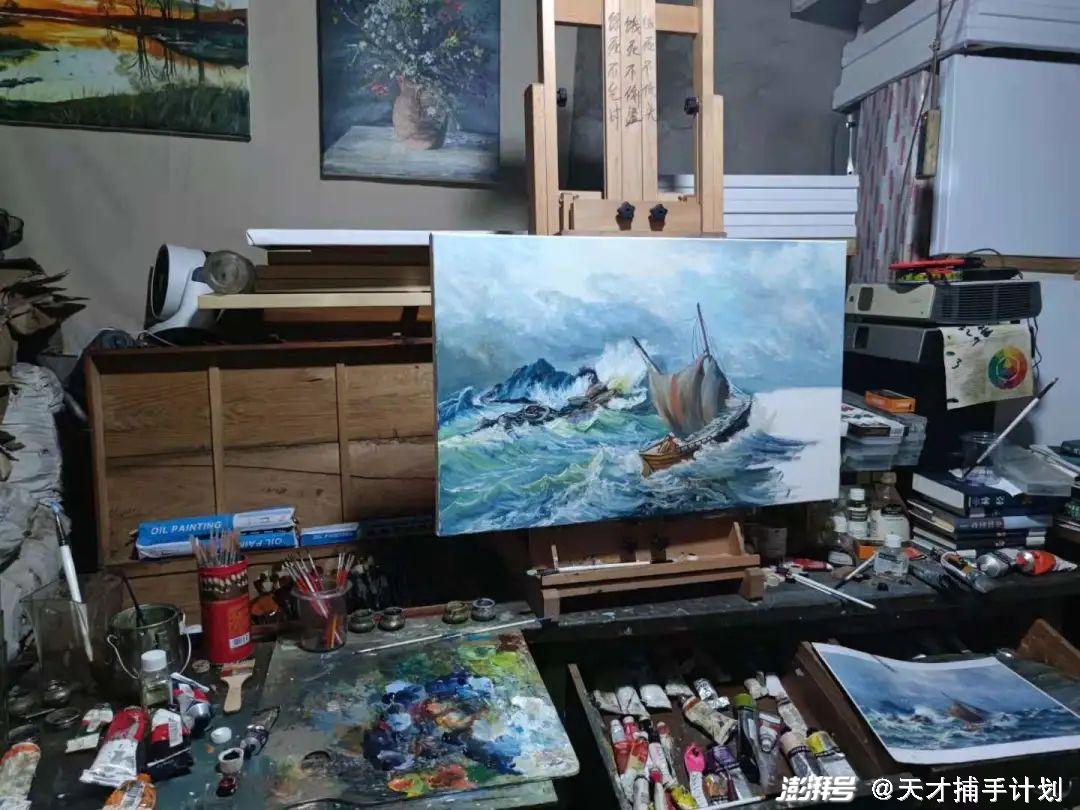 所有的消息回完之后,位光明开始画一副「海浪拍打帆船」的油画。