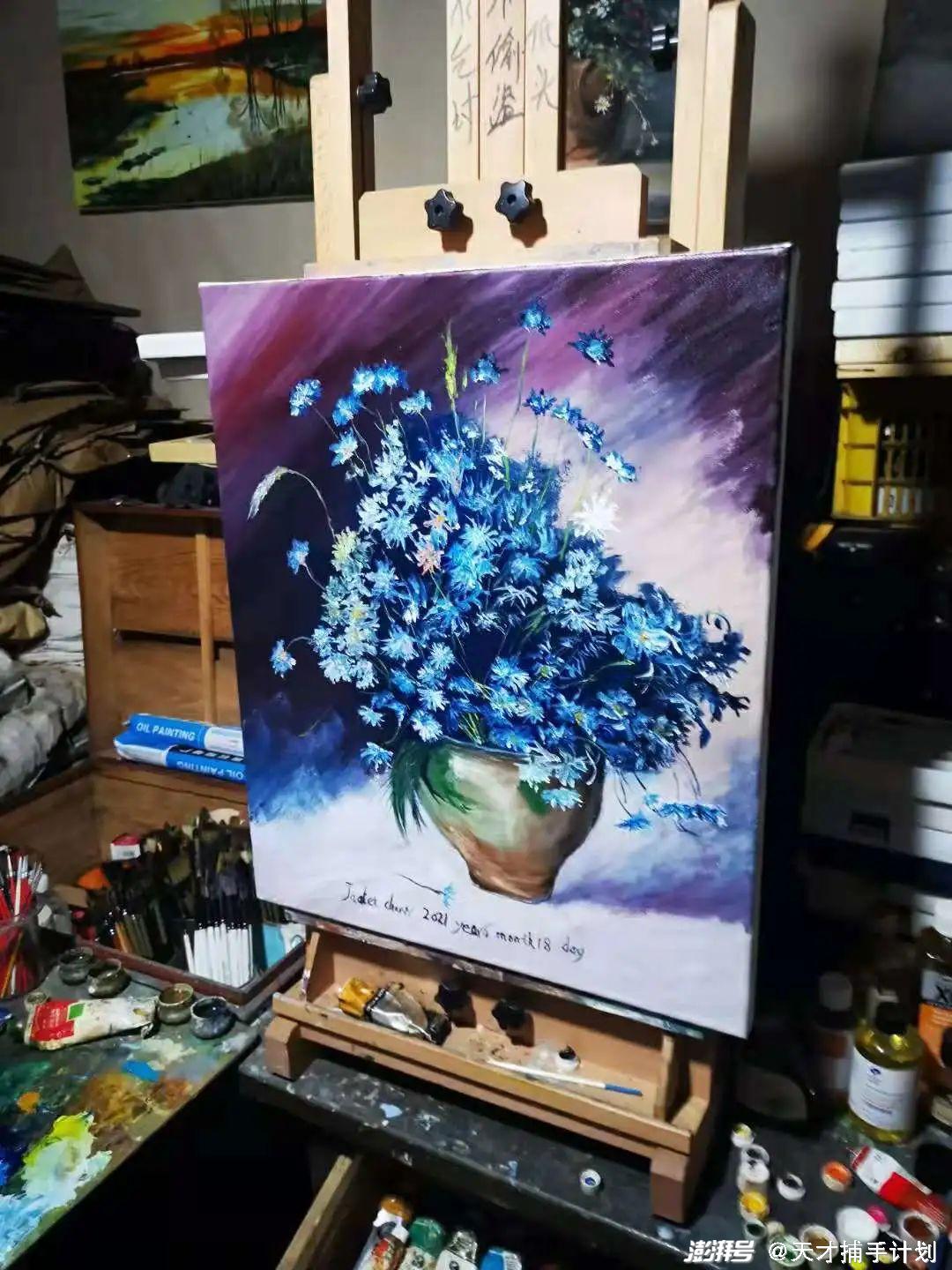 而几张放满了颜料、速干油、画笔的桌子,以及墙上挂的十几幅色彩艳丽的油画,在告诉每一个人:嘿,他还是一个画家。