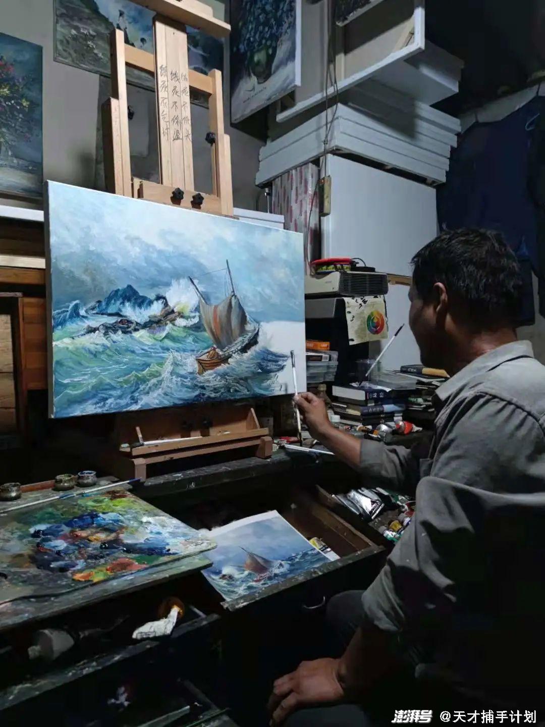 他自己摸索,不收废品的时候,就在家里画。没钱买画架,就只买画布,自己裁成50x60厘米,粘在墙上贴的木板上,趴在墙上画。