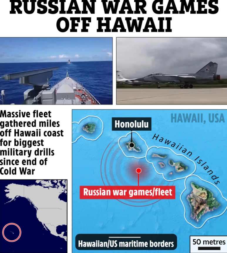 美国军方证实,俄罗斯军舰在太平洋开展远海演习期间,曾进入到距离夏威夷海岸37千米处。这是冷战结束以来俄罗斯海军在东太平洋地区进行的最大规模演习。