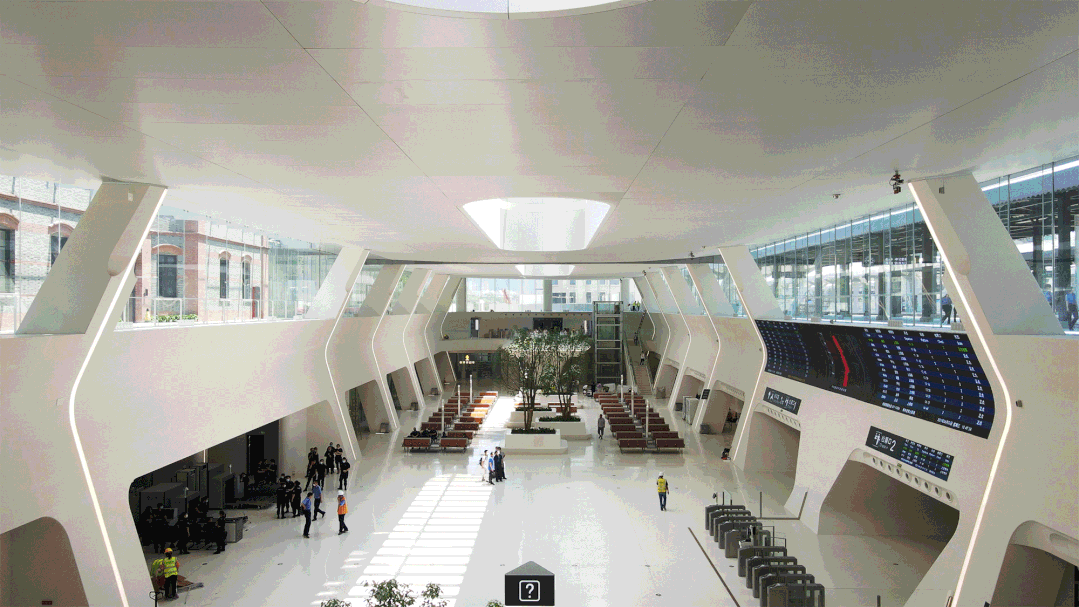 此次嘉兴火车站改扩建工程包括拆除并新建站场设备、既有线路五线改为六线、升级改造车站站房、按照1:1比例还原1921年老站房等,车站设计为地面一层、地下多层,是中国首个全下沉式火车站,复建老站房位于地面一层,与新站房、城市广场、城市森林相互交织,打造绿色生态车站,候车大厅、售票厅等主要交通和商业功能收置于地下。同时,将站房与站前北广场、人民公园连在了一起,把公园的绿植引入站前广场,以高林冠线打造“森林中的火车站”。