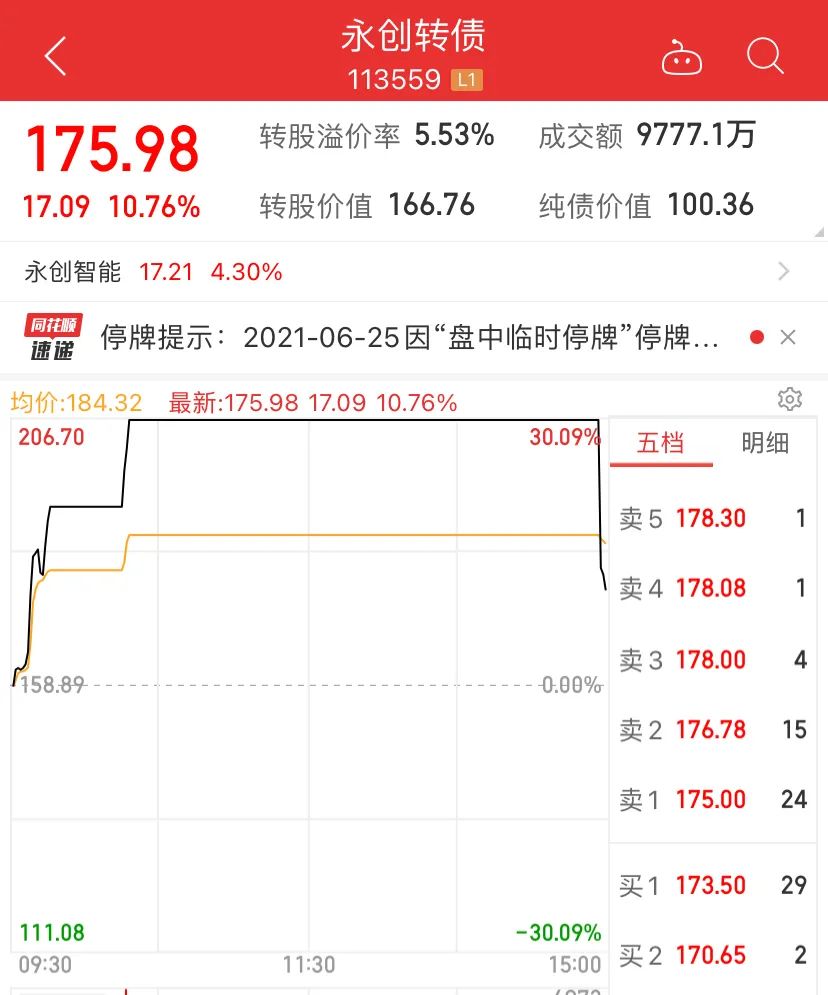 今天206元买入的,如果今天之内没找到别人接盘,或者转股也要亏约20%,没卖没转股的话,下个交易就要变100.405元,亏超50%。也许是意识到了炒作风险,最后复牌3分钟,资金疯狂砸盘出货,最终收报175.98元,收涨10.76%,成交额9777万元。
